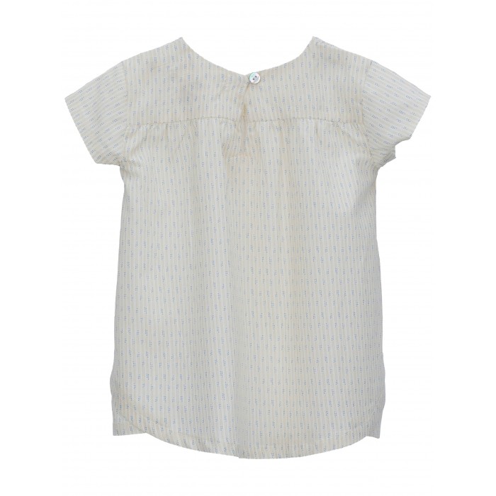 Short sleeved baby dress in light woven 100% organic cotton. Gatherings at chest and fine detail at sides with extra slit. Back opening with seashell button. Off-white with small print of lines and dots in blue and green.