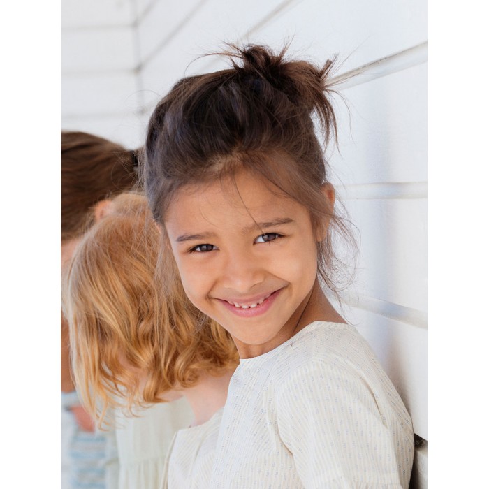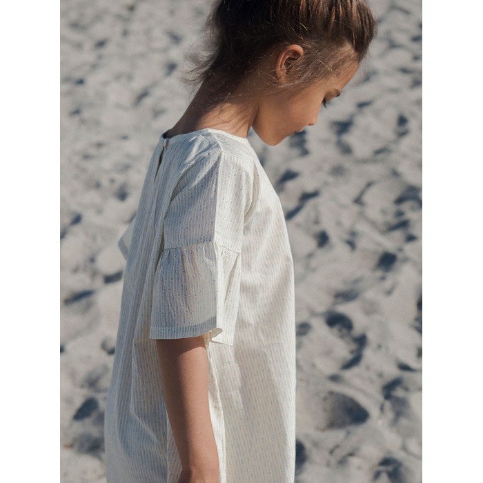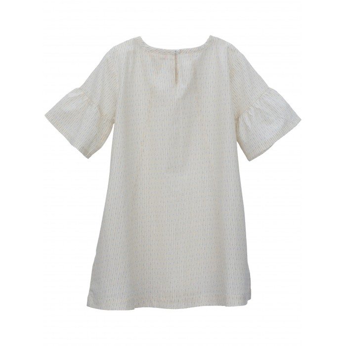 Girl dress in light woven off-white fabric with small print of lines and dots in blue and green. Trumpet sleeves with gatherings, light A-shape, side pockets and back opening with seashell button.