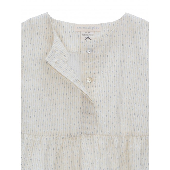 Short sleeved shirt with flair for girls. Hidden buttons at front. Off-white with small print of lines and dots in blue and green in light woven 100% organic cotton.
